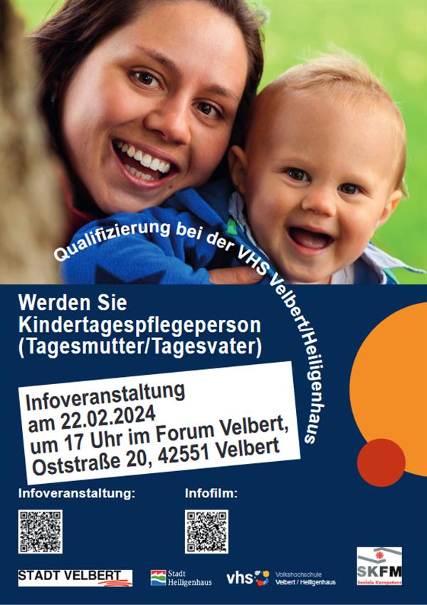 Am 22.2.24 lädt der SKFM in Kooperation mit den Städten Velbert und Heiligenhaus sowie der VHS zu einer Infoveranstaltung zum Thema "Wie werde ich Kindertagespflegeperson (Tagesmutter/vater)?" ein.